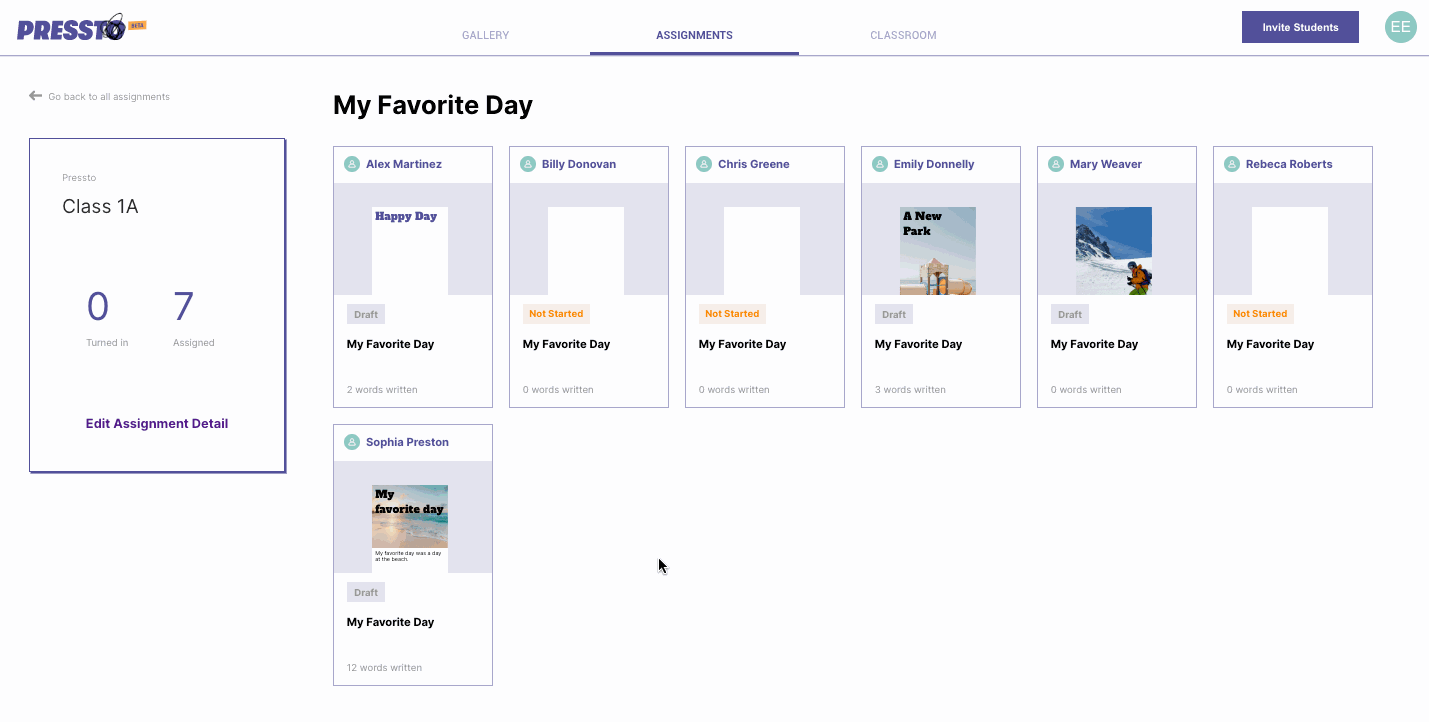 Help home›✍️Write With PresstoReview Writing Buddy TranscriptsDWritten by Daniel Stedman· Updated over 2 years agoTeachers can review the history and transcript of hints for each student. To see a Writing Buddy transcript, open a student's document from the Assignment Review page.