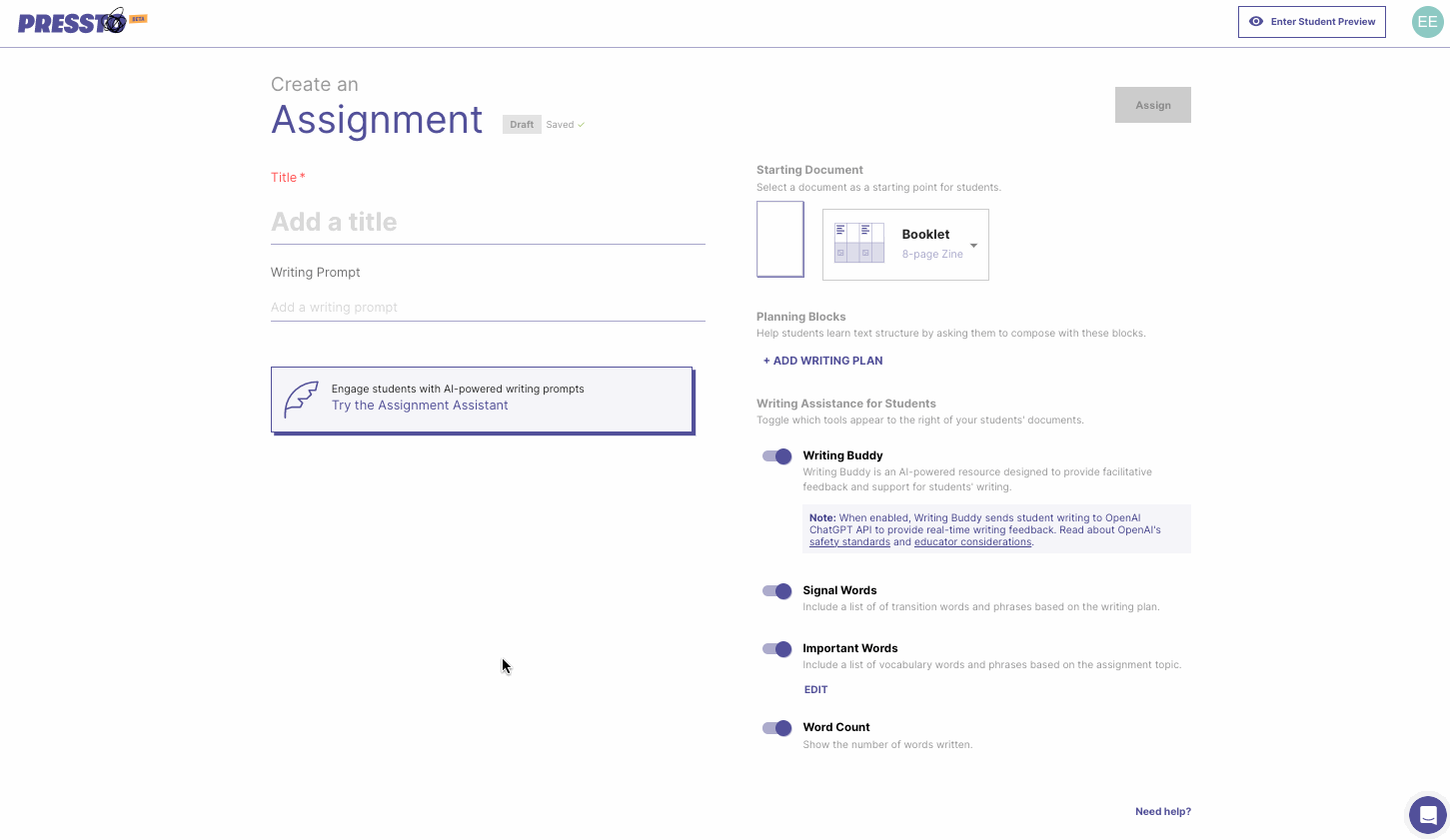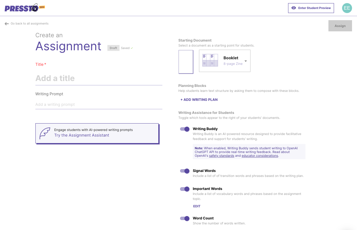 In this page you will customize your assignment. You are able to create an assignment using your own prompt, or use the Assignment Assistant to generate ideas. Keep reading to learn about the features you see on this page.
