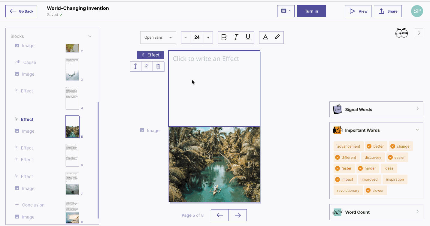 Important Words can be added by the teacher when creating an assignment. Teachers can create the list of words themselves, or use the Assignment Assistant to generate a list based on a topic. As students use Important Words, they are checked off automatically.